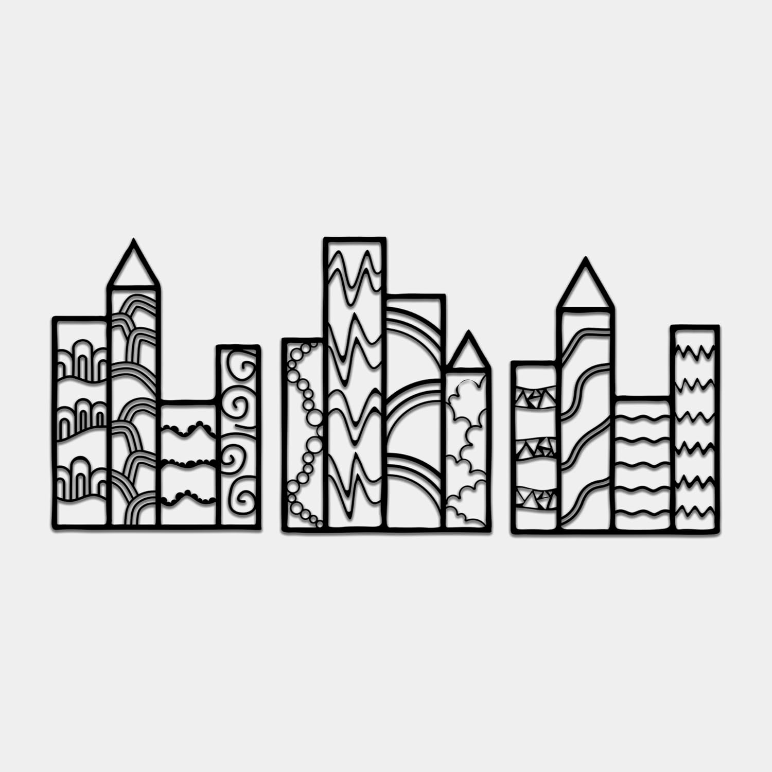 Add a touch of modern elegance to your living space with this captivating cityscape wall sculpture. Designed with abstract geometric patterns, this contemporary piece brings urban artistry into your home. Its sleek, matte black finish and 2 mm steel construction ensure strength and durability without weighing your walls down. The floating effect created by its 2 cm standoff gives the illusion of depth, making it a standout statement in any room.